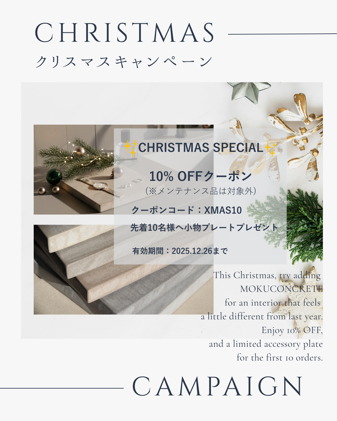 クリスマスキャンペーンのお知らせお知らせ 🎄 Christmas Campaign クリスマスキャンペーンのお知らせ いつも MOKUCONCRETE をご利用いただき、ありがとうございます。 本日より、クリスマスキャンペーンを開催いたします。 全商品 10% […] 続きを読む