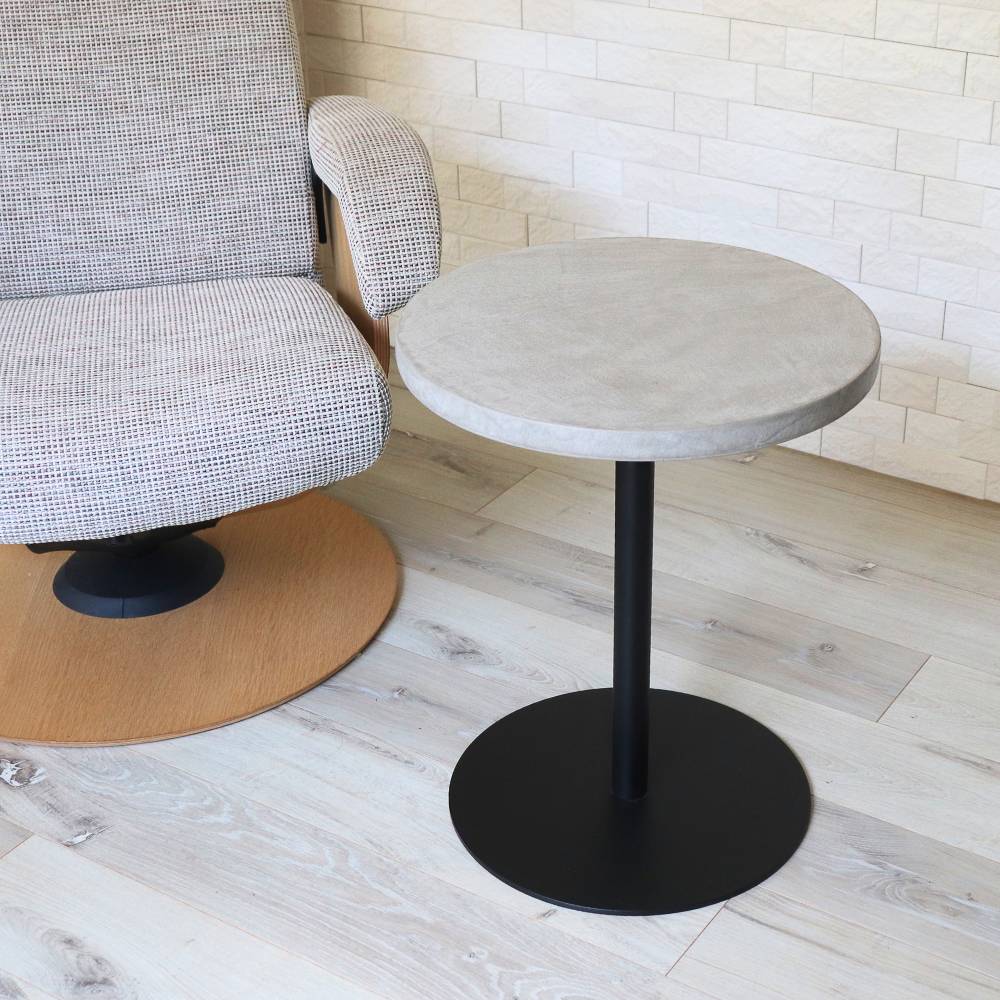 鉱物性マイクロモルタル「モールテックス」を使用したラウンド天板に、粉体焼付塗装を施したアイアン脚を組み合わせたサイドテーブルです。鏝波(こてなみ)の表情がほどよく残る天板は、無機質でありながらやわらかさも感じられる仕上がり。バリのない滑らかなエッジと、ツルリとした質感が特徴です。直径400mm × 高さ500mmのサイズは、ソファやベッドサイドに程よく収まり、空間に軽やかなリズムをもたらします。天板と脚部は接続した状態でお届けするため、設置後すぐにお使いいただけます。脚部にはアイアン素材を採用し、カラーはブラック、ホワイトの2色からお選びいただけます。天板は8色のカラーバリエーション。適度な重みと安定感があり、移動や配置もしやすい仕様です。モダン、和モダン、ジャパンディの空間に自然と馴染み、サイドテーブルとしての使用に加え、植物台やアート作品の展示台、商業空間での商品展示台としてもお使いいただけます。